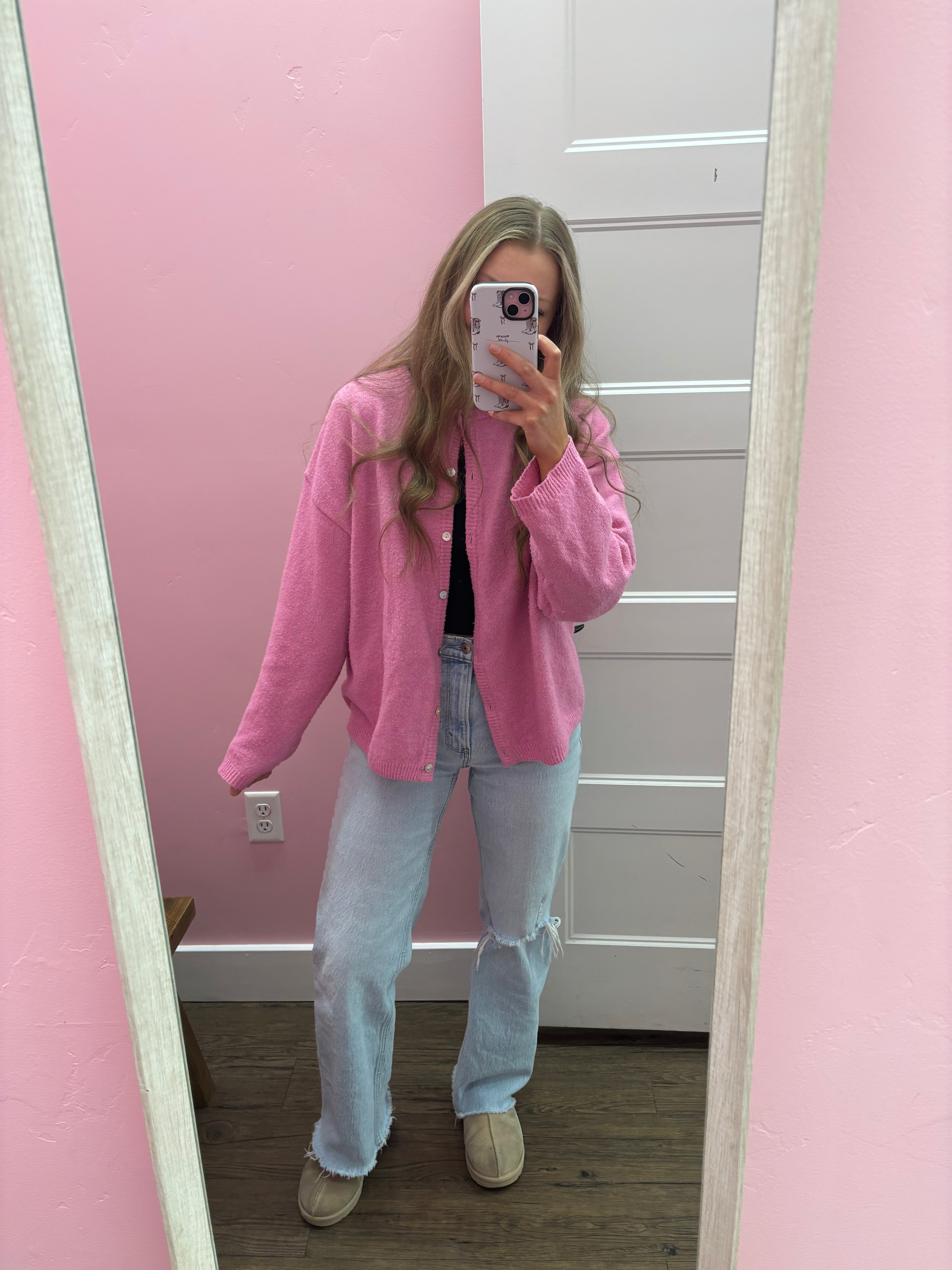 Pink Crew Neck Cardigan Sweater